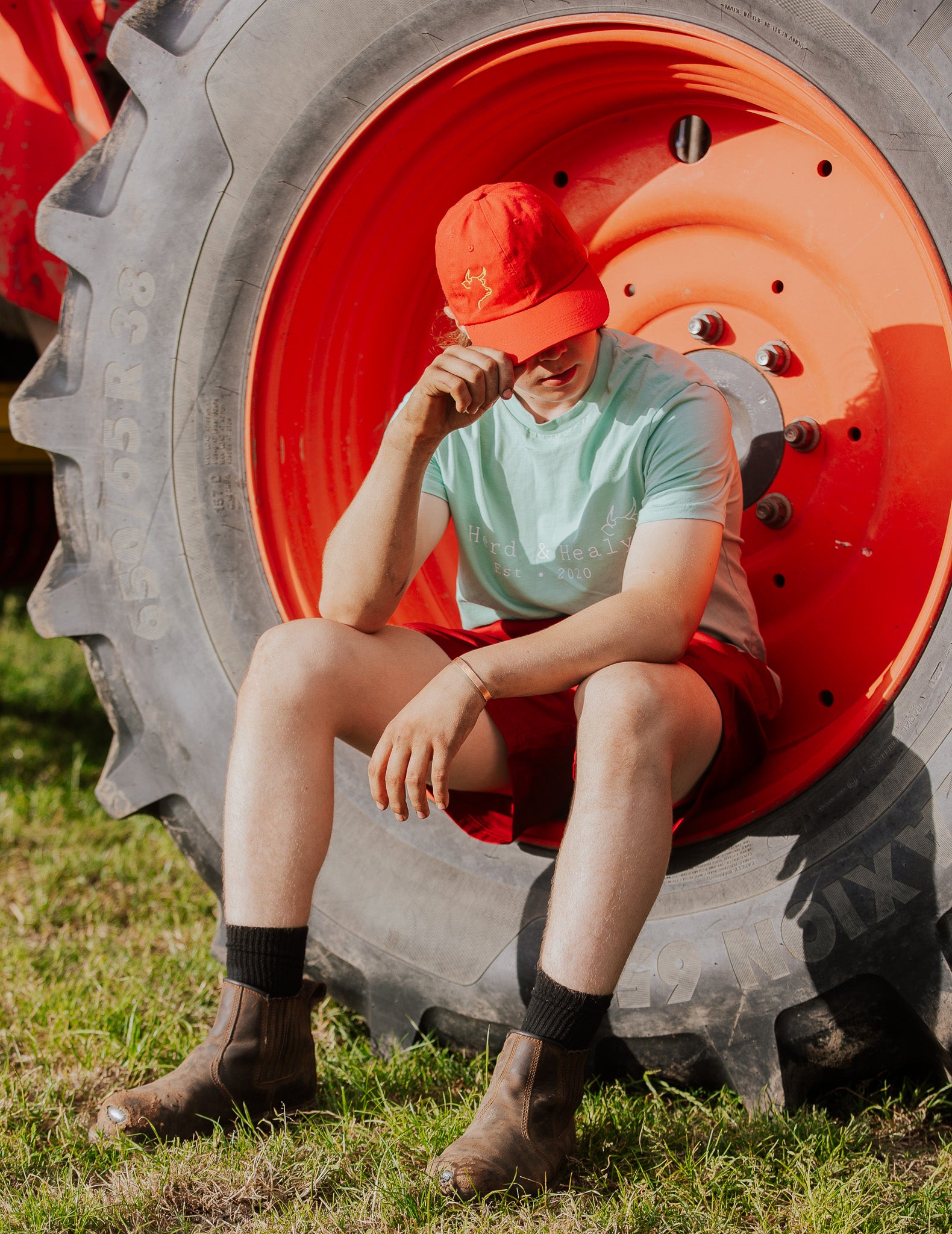 A lightweight 6 panel, 100% cotton twill cap in red with an adjustable strap, featuring our signature cow logo embroidered on the front right and our name on the back.