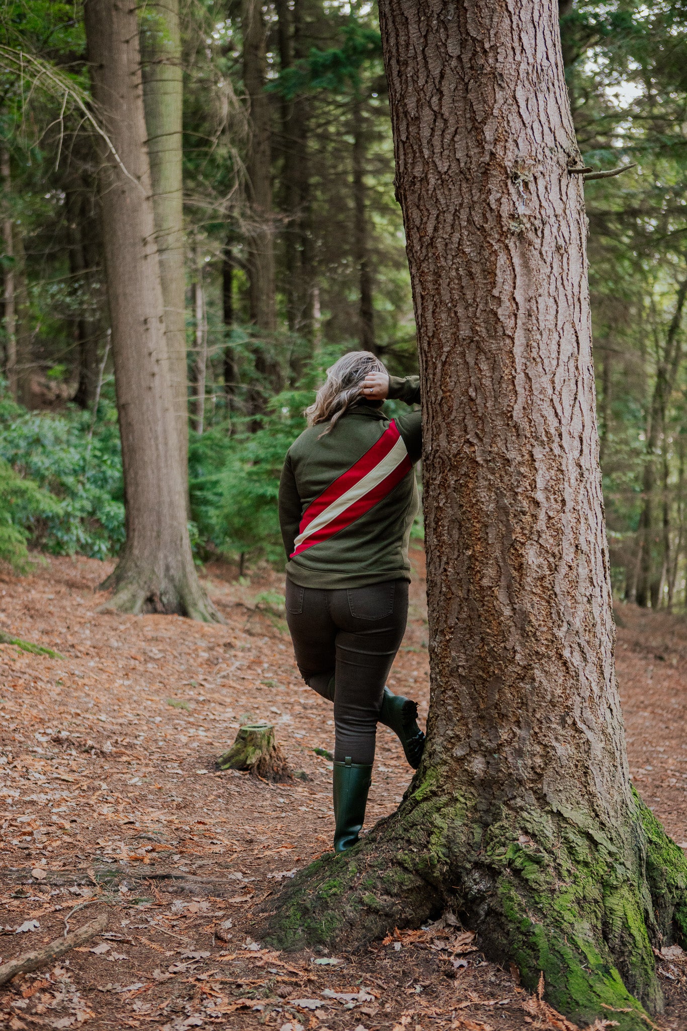The Khaki Combine Quarter Zip sweatshirt features a burgundy and cream diagonal stripe and is adorned with our signature cow logo on the left chest. Topped off with a brass zipper, this sweatshirt guarantees both style and quality.