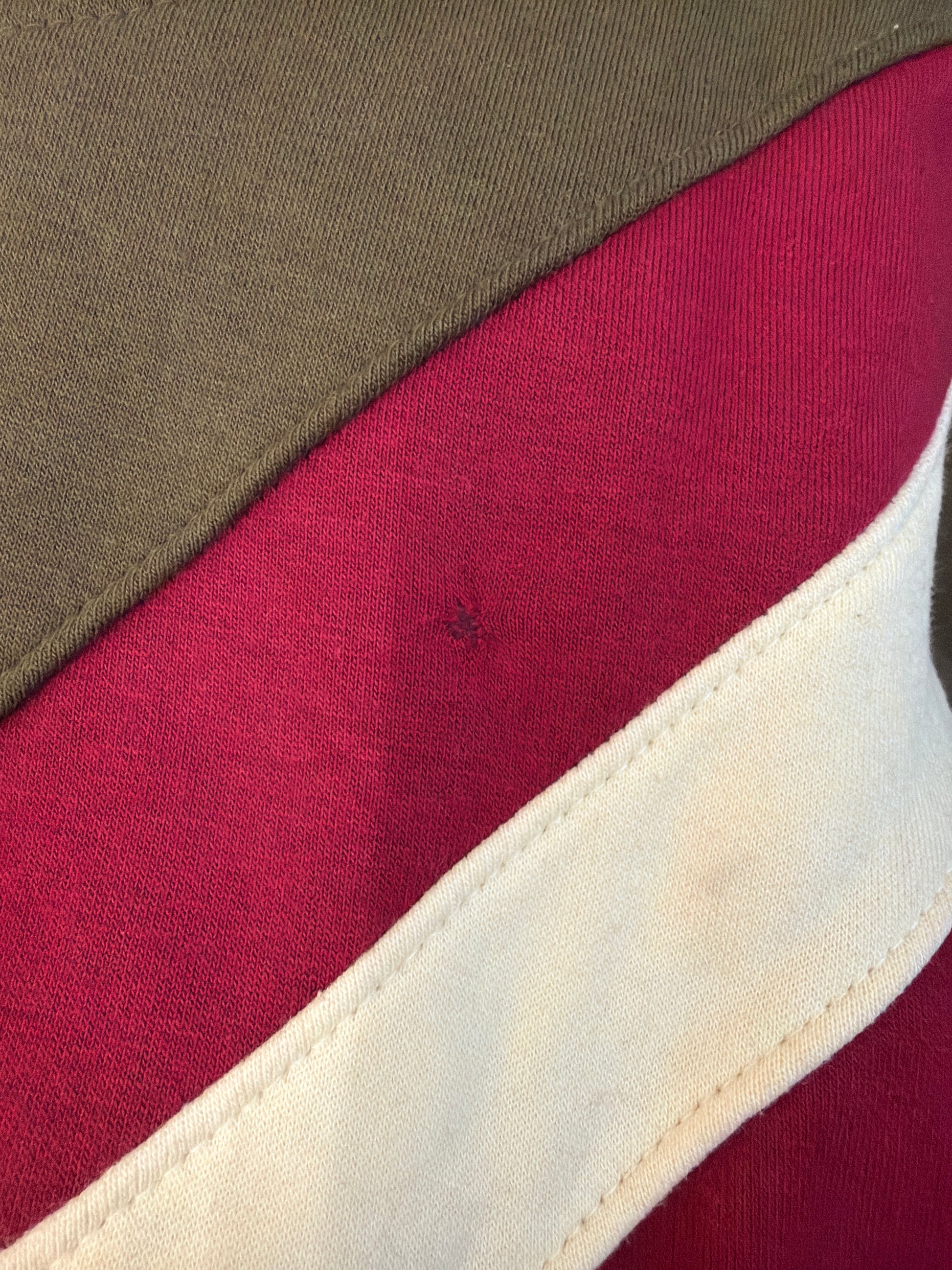 Hole stitched up on burgundy stripe on back